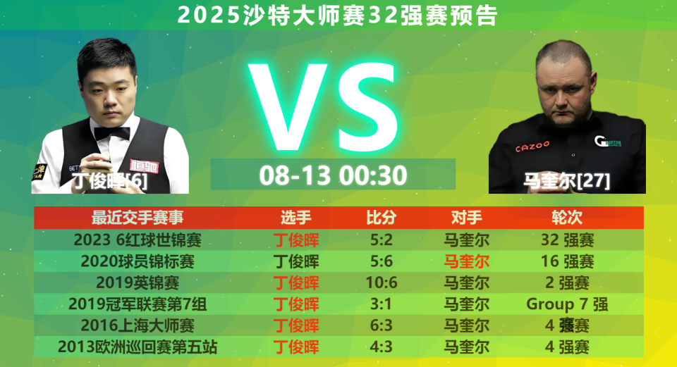 两人曾交手19次,丁俊晖10胜8负1平占优,马奎尔在本届沙特大师赛从第3轮80强开始打起,他先后4-3击败艾伦·泰勒,48强5-0击败安东尼·麦克吉尔,32强将于8月13日0点30分对战丁俊晖。